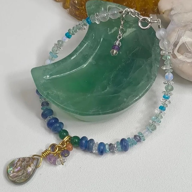 美しい光沢を放つアヴァロンシェルをアクセントに、カイヤナイトやアパタイトなどブルー〜グリーン系の天然石を組み合わせたブレスレットです。 透明感のある水晶と、深みのあるクロムダイオプサイトが全体を引き締め、爽やかで落ち着いた印象に仕上げています。 動きに合わせて揺れるシェルチャームが、さりげない華やかさをプラス。 季節を問わず使いやすく、手元に清涼感を添えるデザインです。 それぞれの石は、一般的に以下のような意味合いで親しまれています。 ・カイヤナイト:整理・落ち着き ・アパタイト:前向きさ・活力 ・クロムダイオプサイト:癒し・調和 ・アメジスト:穏やかさ・安らぎ ・水晶:浄化・バランス 日常にそっと寄り添うような、涼やかな一本です。 【サイズ】 約16cm+アジャスター約2.5cm 使用上の注意 ・強い力や引っ張りにより、破損の原因となる場合があります。 ・シェルは衝撃に弱いため、落下などにご注意ください。 ・水や汗、化粧品などによりメッキ部分の変色や劣化が生じる場合があります。 ・ご使用後はやわらかい布で軽く拭いてください。 ・天然素材のため、色味や形状には個体差があります。 ・犬・猫を飼育している環境で制作しております。アレルギーのある方はご注意ください。