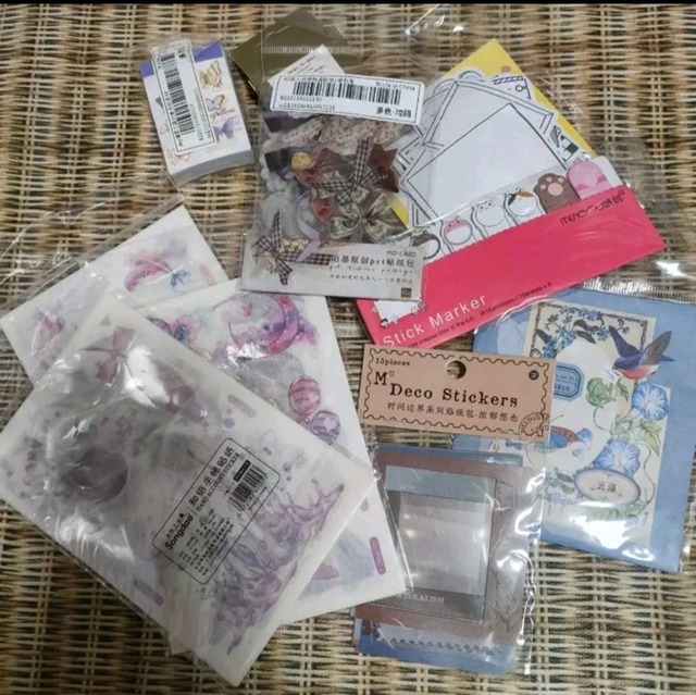 コラージュ紙モノ素材 10点セットです。 海外輸入製品を中心に、小さめシール多めで組み合わせています。 ハガキ大ほどの和紙女の子シールは3〜4セット必ず入ります。 女の子シールセットは切れ目入りタイプで使いやすく、背景向けシールもセットになっているため、届いてすぐにコラージュを楽しめます。 これからコラージュを始めたい方、何を揃えたら良いか分からない方、まとめて素材を揃えたい方 にとてもおすすめのセットです。 ■セット内容 ・コラージュ素材 合計10点 (小さめシール多め) ※内容は画像をご確認ください。(一例です) 最後の写真の8セットをご用意しました。 どのセットも同じ位お得な内容となっています。 どれが届くかは届くまでのお楽しみに。 ■ご注意 ・複数購入の場合、和紙女の子シール6枚セットは内容が重複する場合がございます。 ・海外輸入製品のため、印刷ズレ・折れ・パッケージの傷み等がある場合がございます。 ・未使用品ですが、数年自宅保管していたものも含まれます。 ・自宅に犬、猫がいます。気になる方やアレルギーをお持ちの方はご購入をお控えください。