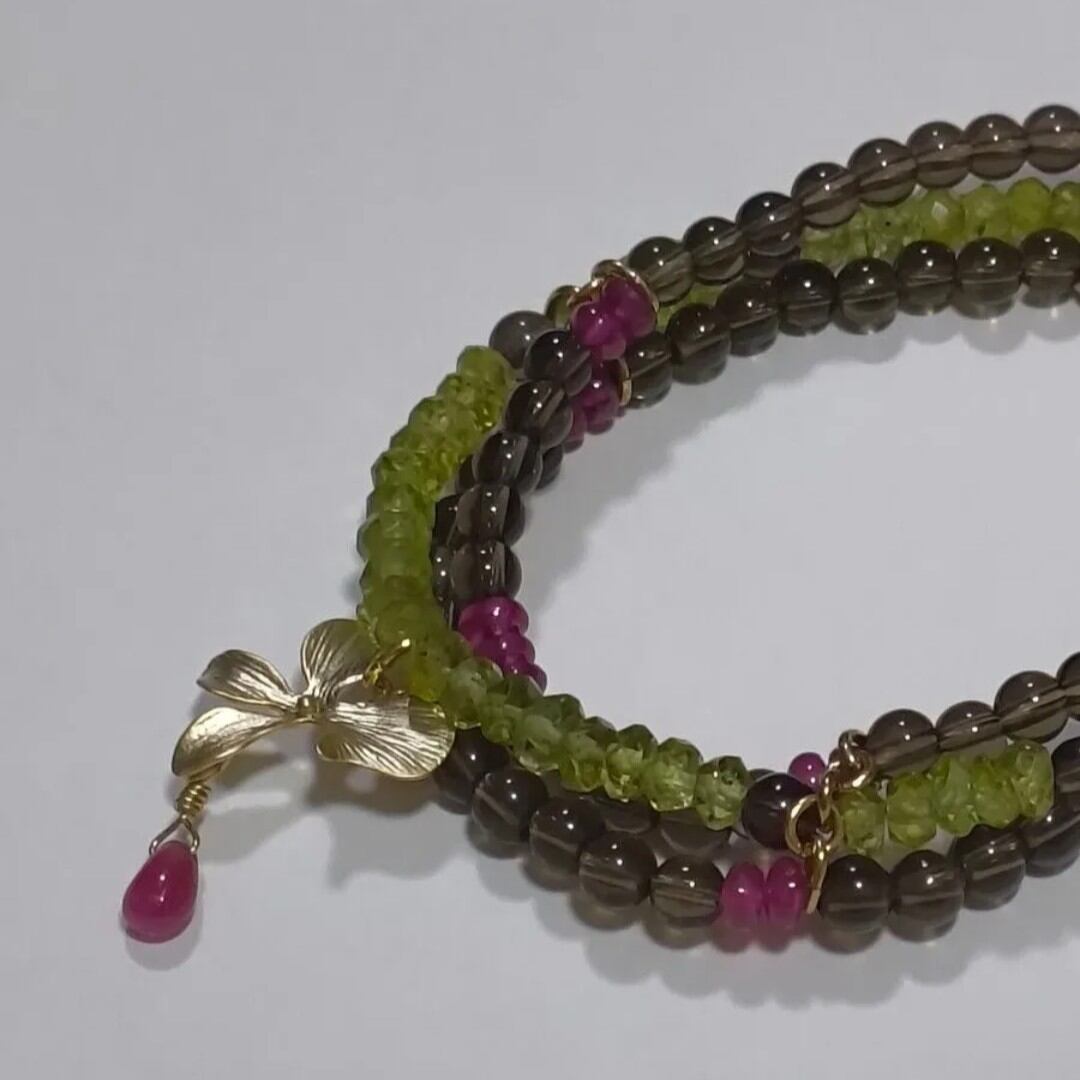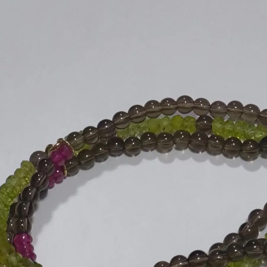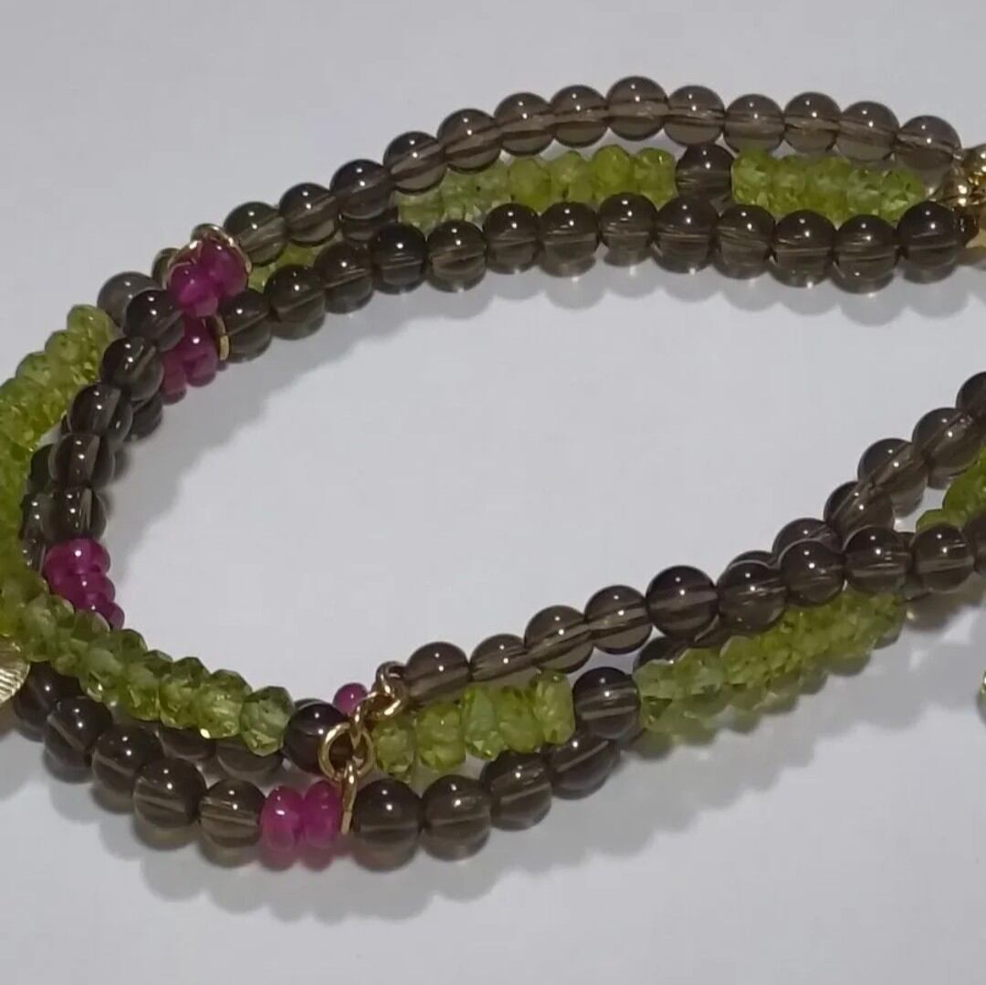 深みのあるスモーキークォーツをベースに、みずみずしいグリーンのペリドットと鮮やかなルビーをアクセントにしたブレスレットです。