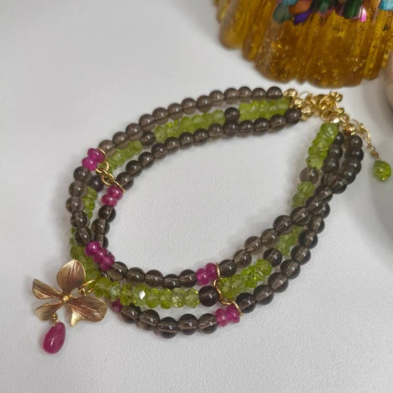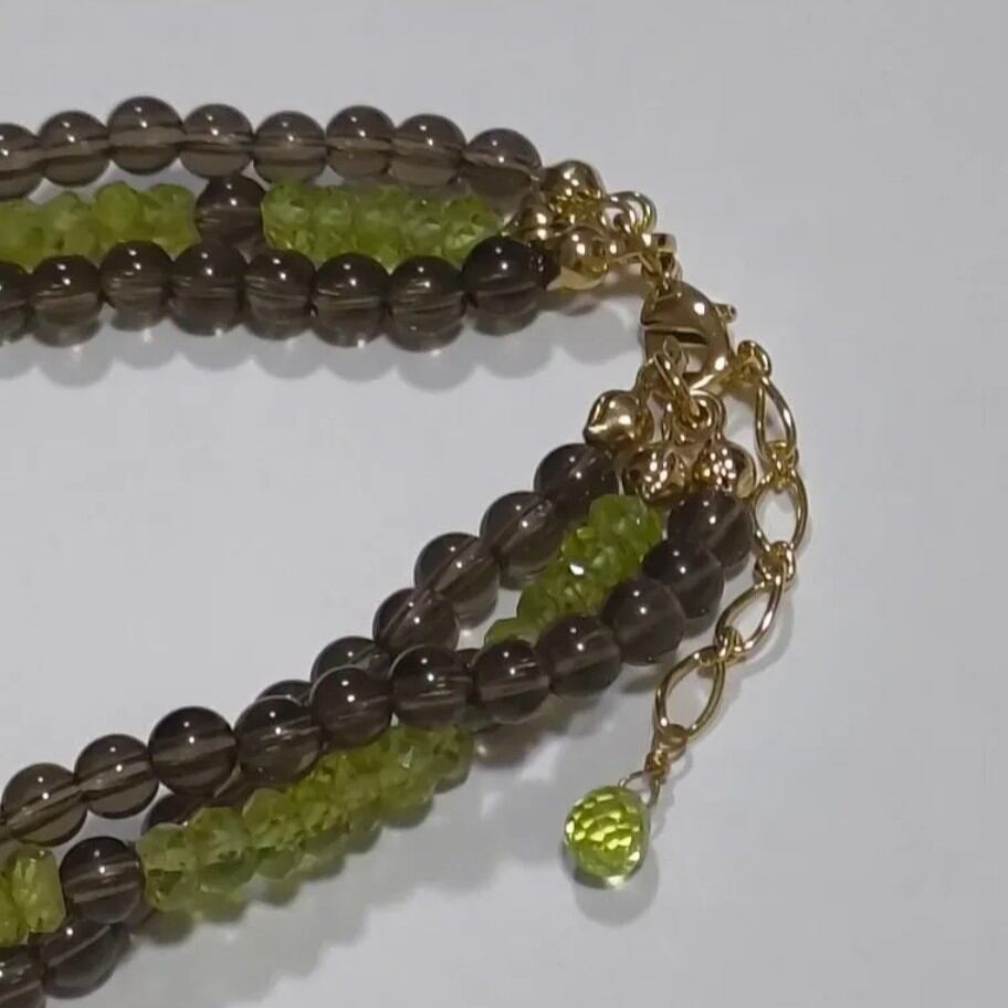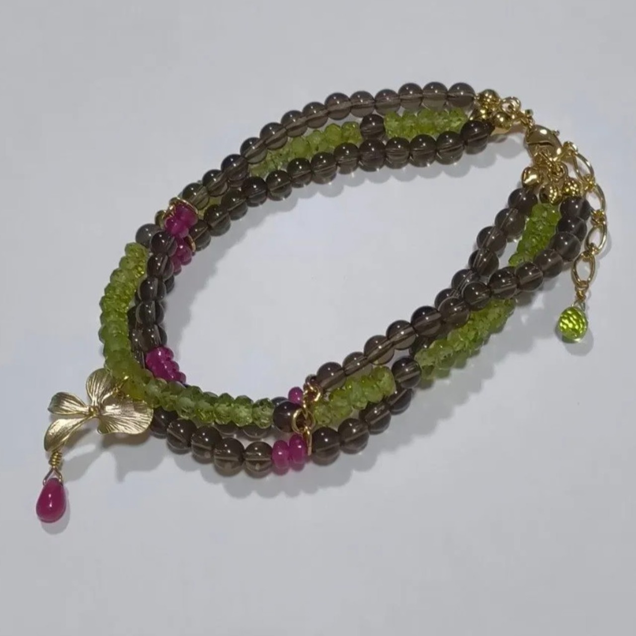 深みのあるスモーキークォーツをベースに、みずみずしいグリーンのペリドットと鮮やかなルビーをアクセントにしたブレスレットです。