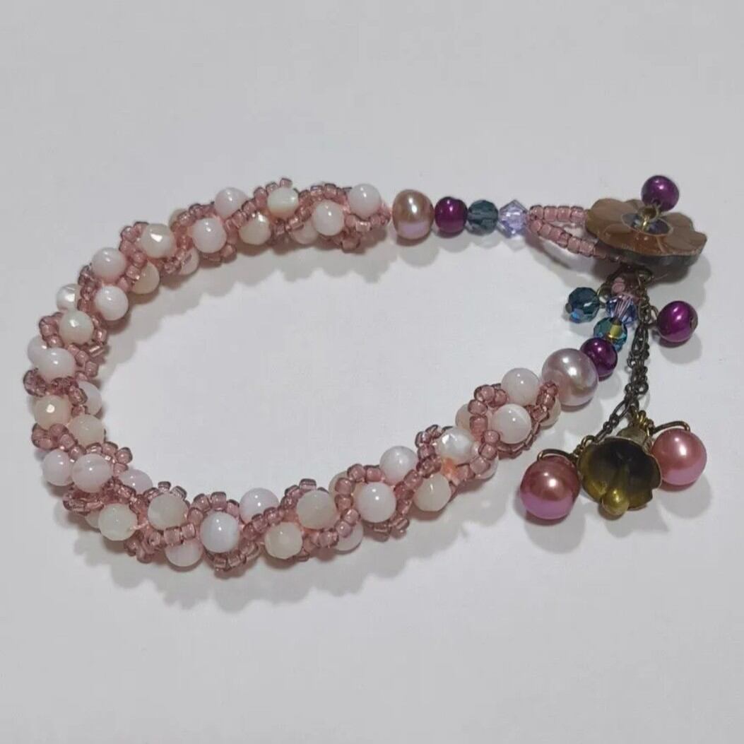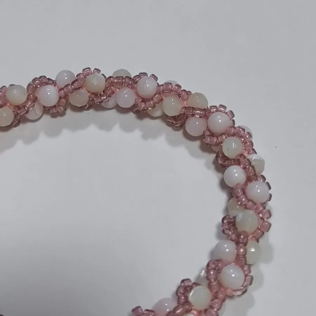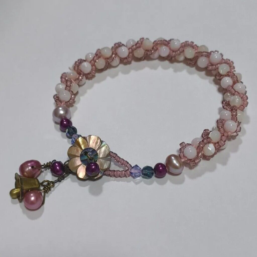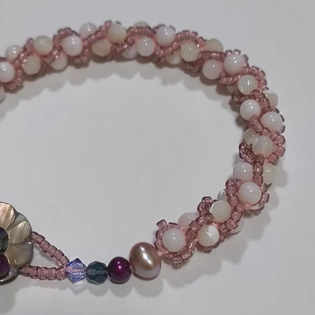 淡水パールとマザーオブパールを組み合わせ、やわらかなピンクの国産丸小ビーズで丁寧に編み込んだブレスレットです。
