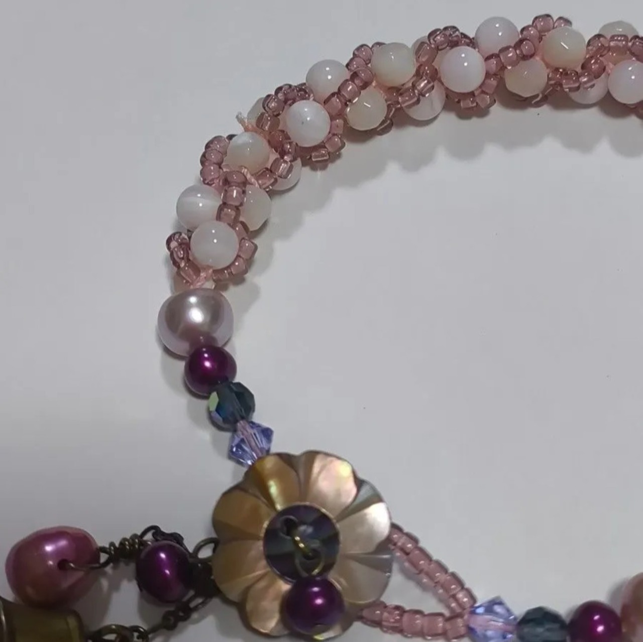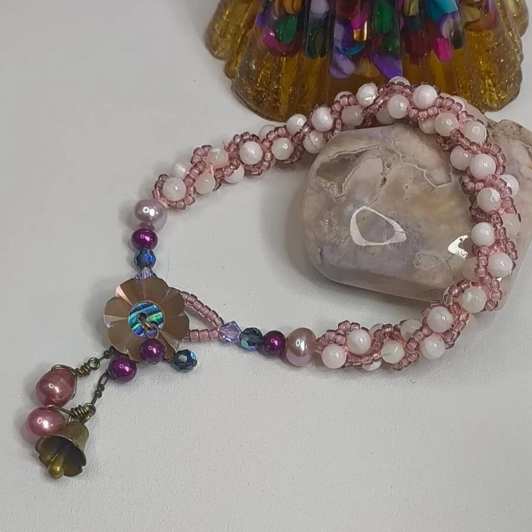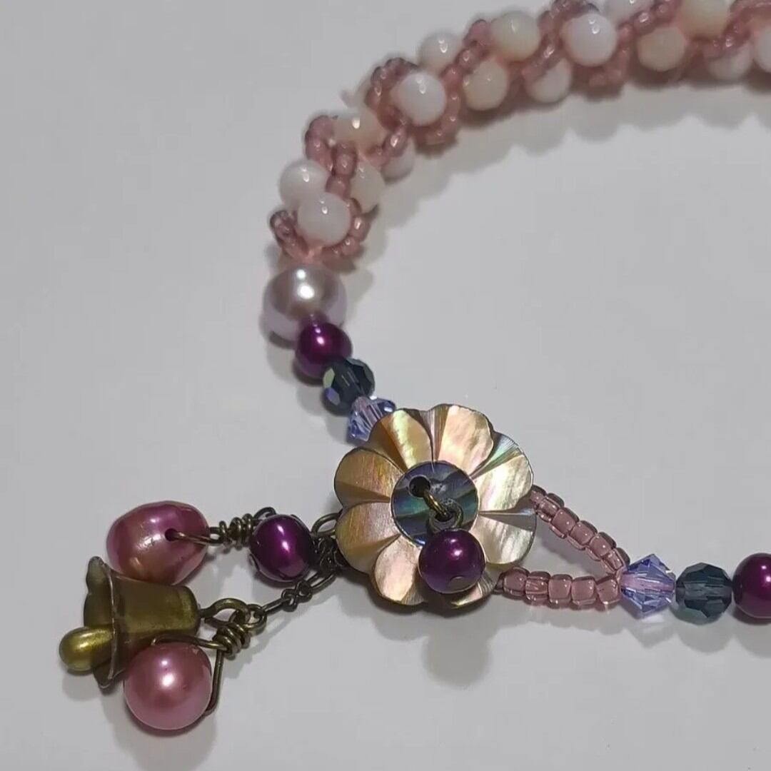 淡水パールとマザーオブパールを組み合わせ、やわらかなピンクの国産丸小ビーズで丁寧に編み込んだブレスレットです。