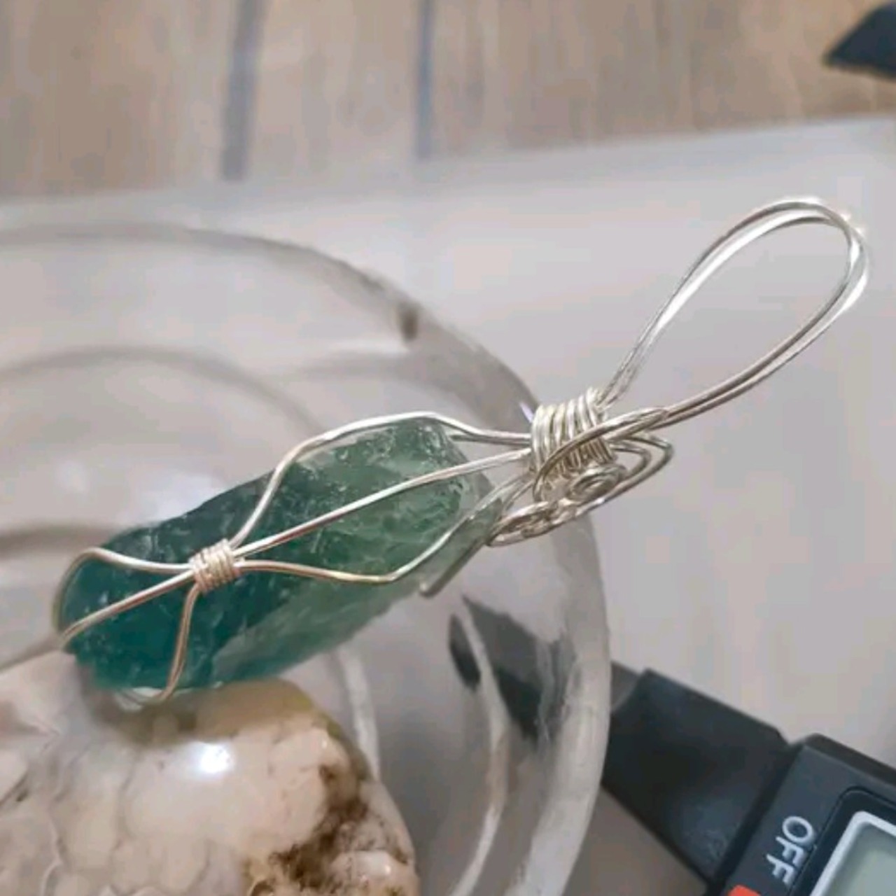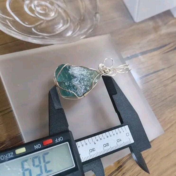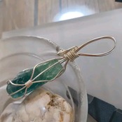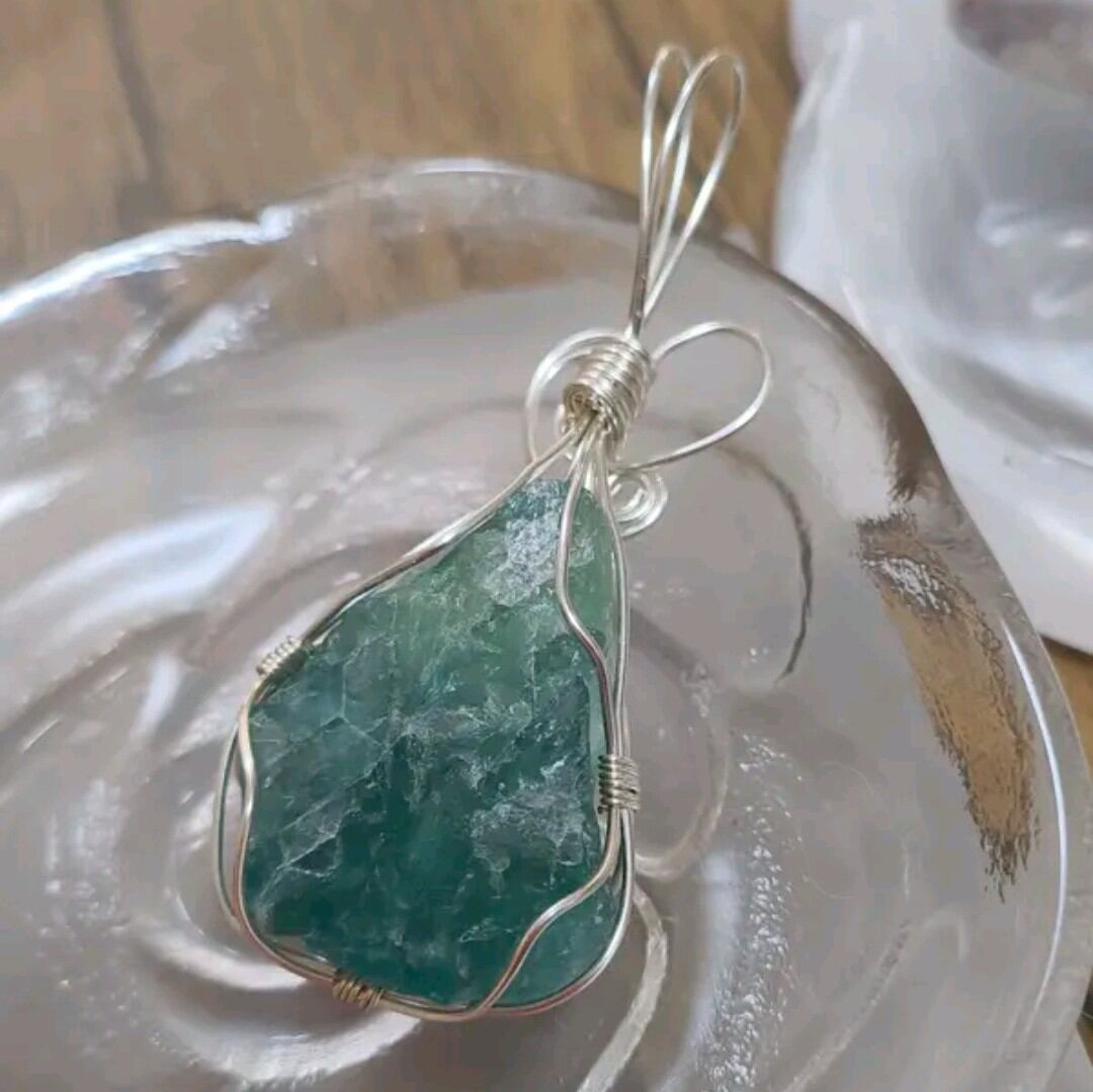 深みのあるグリーンが印象的なフローライト原石を、アクセサリー用ワイヤーで丁寧に包み込んだペンダントです。