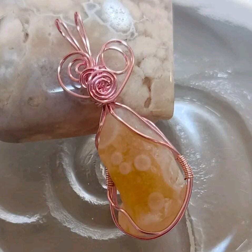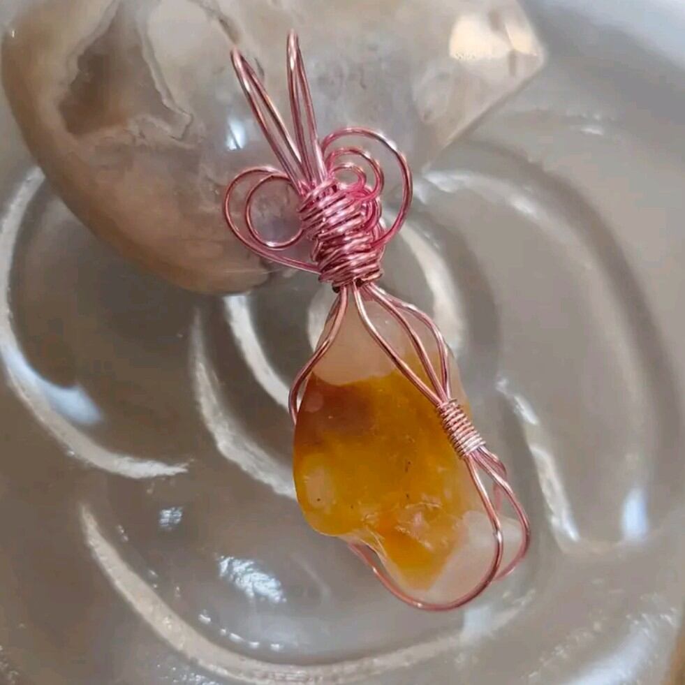 あたたかみのあるオレンジカラーと、やわらかな模様が特徴的なゴビアゲート原石を、アクセサリー用ワイヤーで丁寧に包み込んだペンダントです。