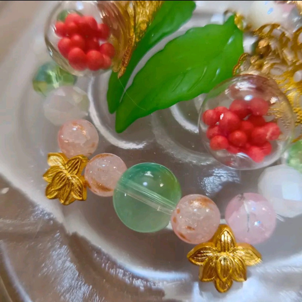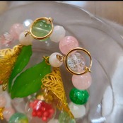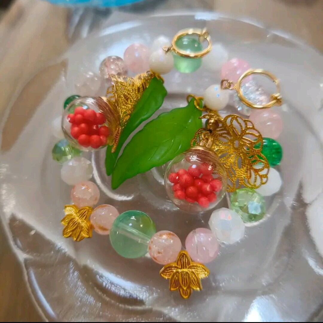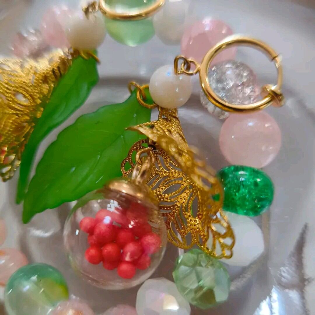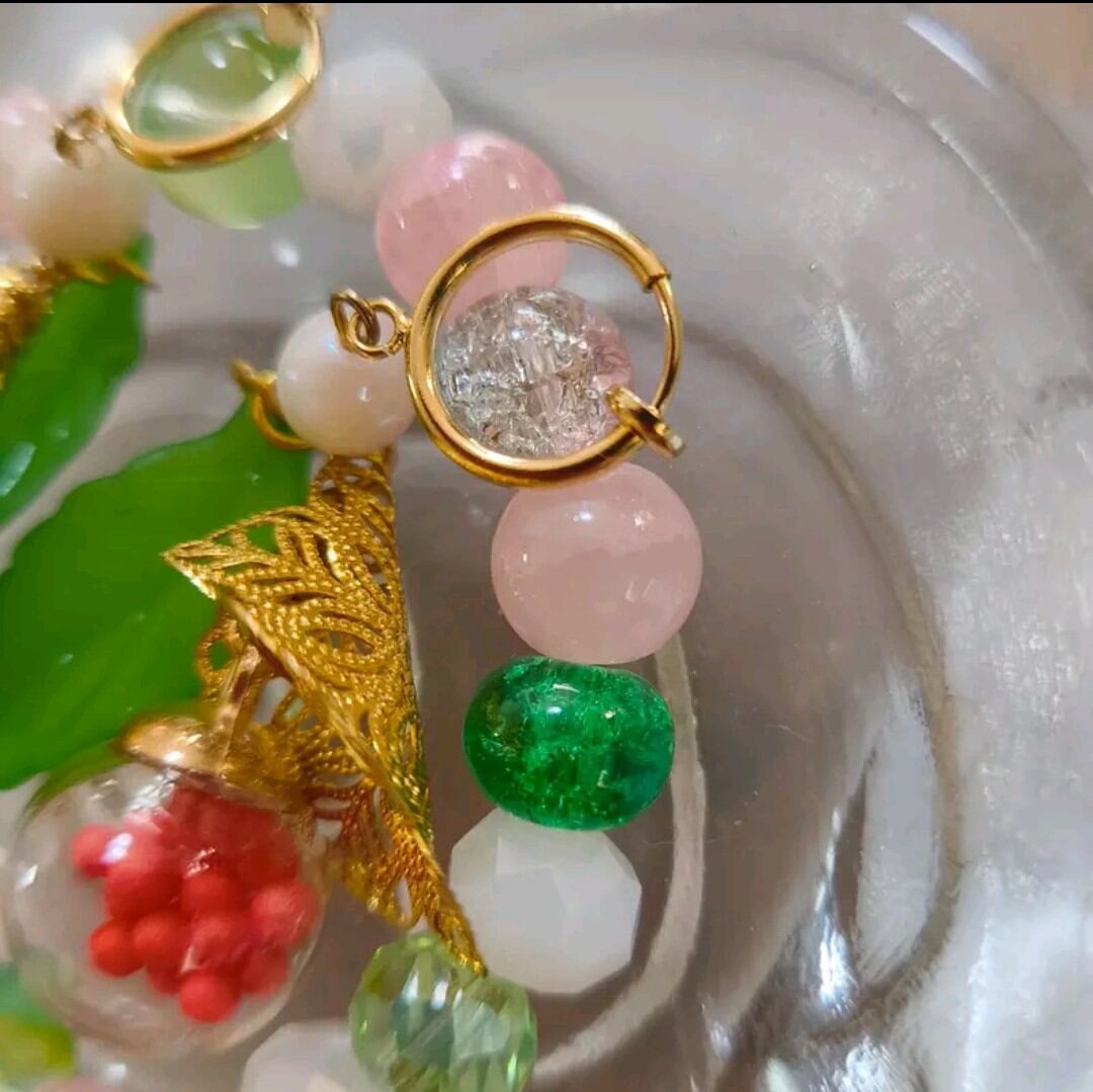 透明感のあるビーズに、グリーンやピンクのやさしい色合いを合わせ、軽やかで可憐な印象に仕上げました。