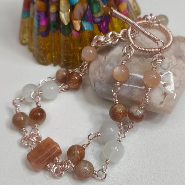 サンストーンらしいギラギラ感のある石と優しい印象のホワイトムーンストーン、オレンジムーンストーンを使用したブレスレットです。 マンテル部は小沼美紀先生の技法で作成しています。 全てアーティスティックワイヤー使用。 サイズ約16cm 自分用に製作し保管しておりました。ご活用いただける方にお譲りできたらと出品しました。 注、アーティスティックワイヤー使用 メッキの変色防止のため使用後は乾いた柔らかい布でお拭きになりチェック付ポリ袋で保管をお願い致します。 犬、猫と生活しております。 動物アレルギーの方はご検討の上、ご購入よろしくお願い致します。